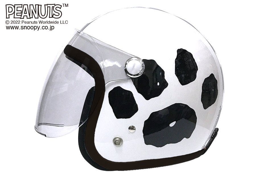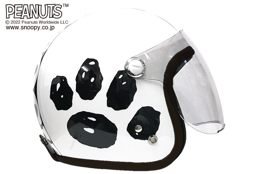 ●雨、風、ほこり、日光から顔を守るライトスモークカラーシールド付! ●スヌーピーの足跡をメインにあしらったシンメトリーデザイン ●顎紐はラチェット式 ●ワンタッチであごひもが脱着できるプラバックル採用 ●スヌーピーデザインのシールド保護フィルム付き