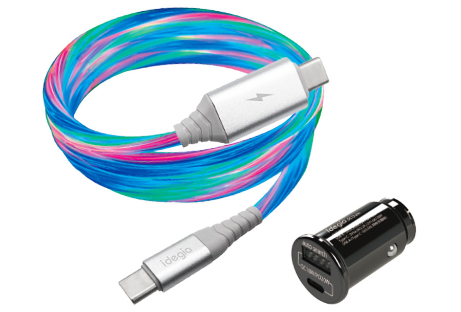 ケーブルの発光について:電気マークのついているコネクタからロゴマーク(Idegia)のついているコネクタにかけて明るさが異なります。
