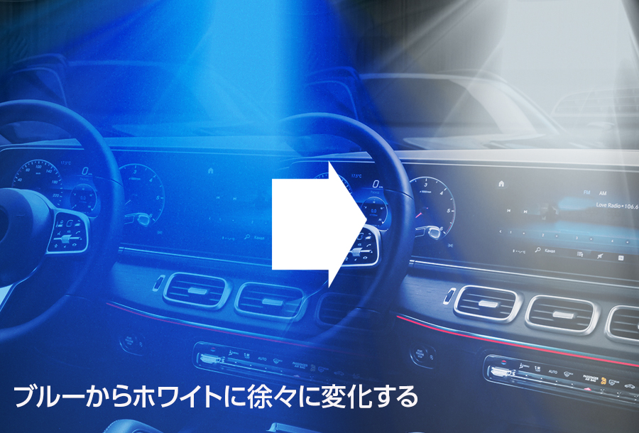 ●ブルーからホワイトに変化するウェルカム仕様 ●耐久性に優れたLEDバルブを採用。 ●LEDバルブ採用で透明感のある発光。 ●バッテリーに優しい省電力。