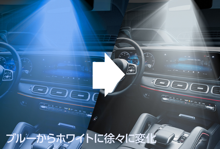 ●ブルーからホワイトに変化するウェルカム仕様 ●耐久性に優れたLEDバルブを採用。 ●LEDバルブ採用で透明感のある発光。 ●バッテリーに優しい省電力。